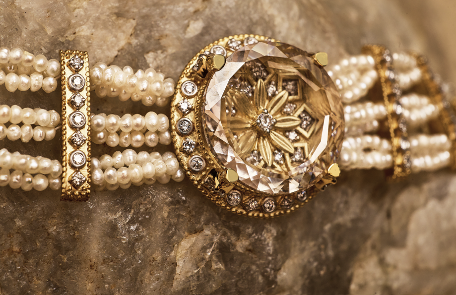 The collection reinterprets these architectural motifs through a distinctive craft innovation. Each piece features 7 to 13 carat rose-cut and portrait-cut diamonds. Their flat, transparent surface allows light to pass through the stone, revealing hand-engraved architectural motifs in gold beneath. As light passes through the stone, the engraved motifs beneath are revealed, bringing the architecture to life