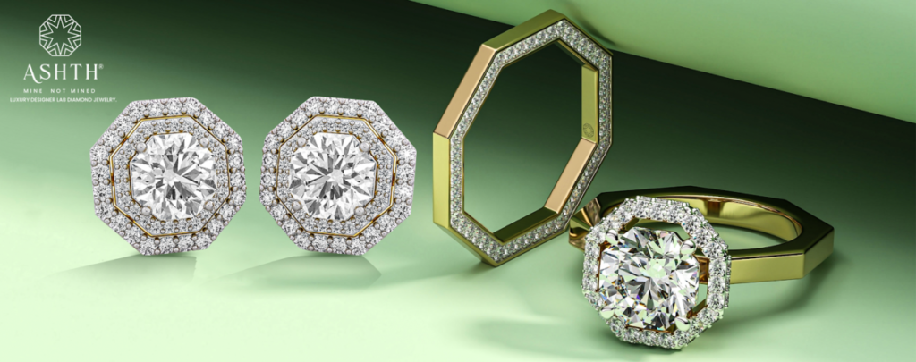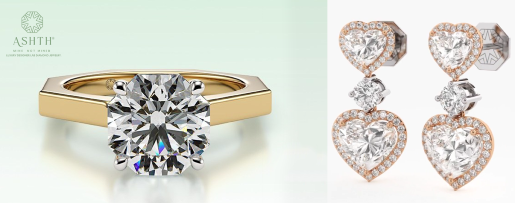 - A 97-facet signature “Ashth cut” ring representing proprietary intellectual property