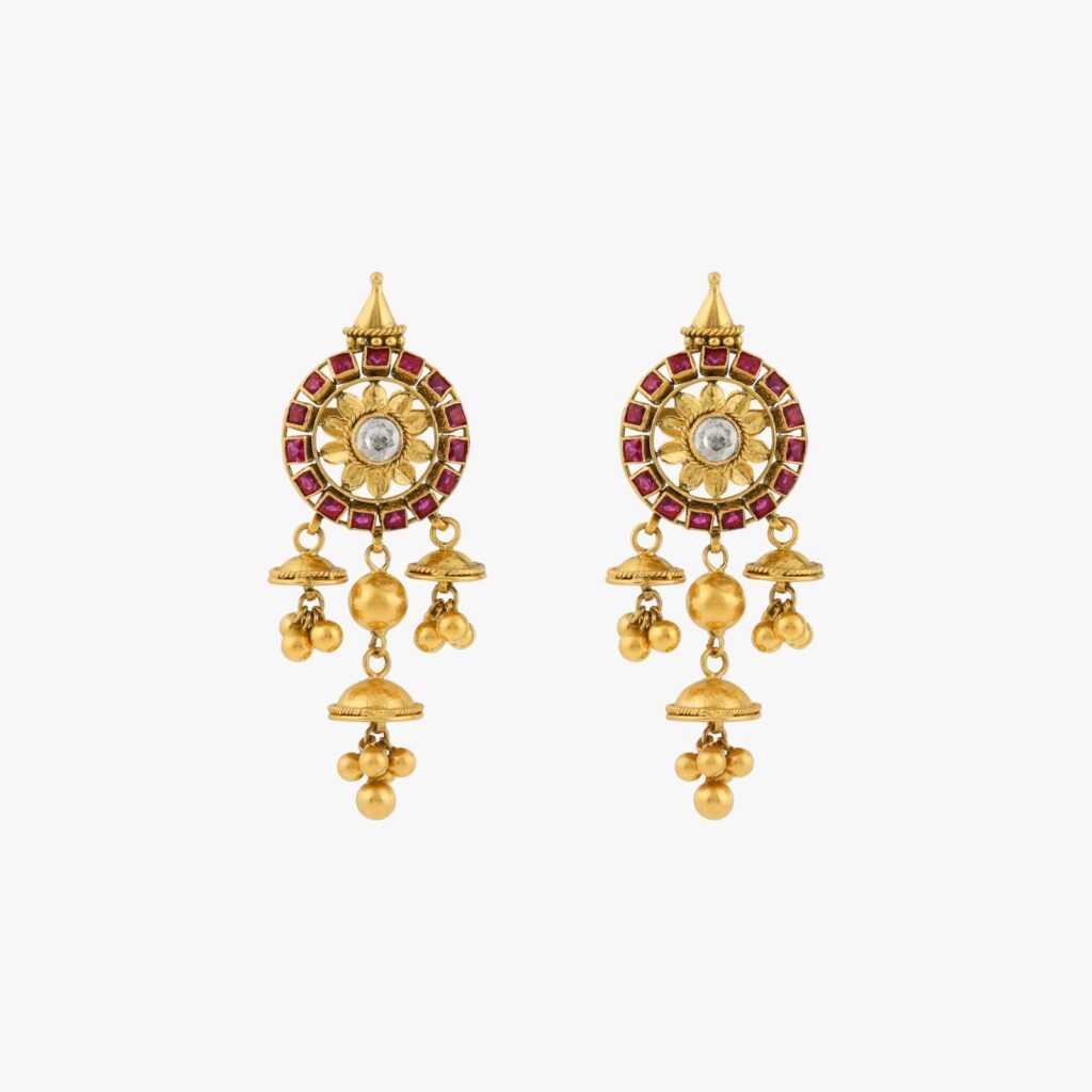 These exquisite gold jhumka earrings from Kalyan Jewellers feature a circular design with a central white stone, surrounded by radiant red gemstones and delicate floral motifs. Adorned with traditional bell-shaped drops and gold beads, they exude ethnic charm. Gift these timeless beauties to your sister this Bhai Dooj, celebrating her elegance.