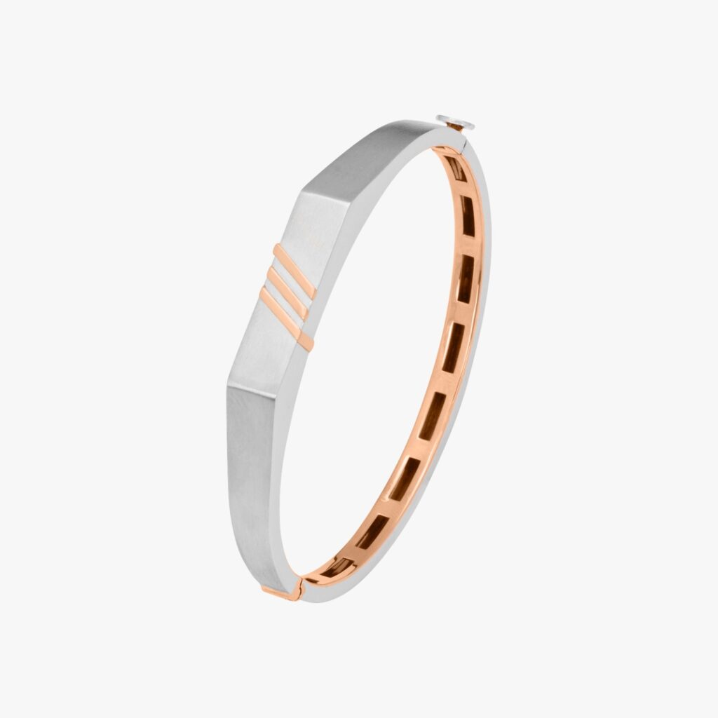 Elevate your brother’s everyday style with this sleek, dual-tone kada/men’s bracelet, crafted from a striking combination of matte-finish white and rose gold. The contemporary geometric design is accented with three parallel rose gold lines, adding a bold touch to its minimalist aesthetic. With a refined, structured build and a smooth inner lining for comfort, this piece is a perfect gift to your brother this Bhai Dooj to honor your bond with enduring elegance.