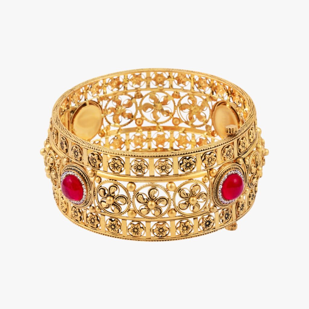 This stunning gold bangle from Kalyan Jewellers features intricate filigree and floral cut-out designs, embellished with vibrant red cabochon stones. Its ornate, traditional craftsmanship exudes elegance. Gift this magnificent piece to your sister this Bhai Dooj, a radiant symbol of your love and her cherished place in your life.