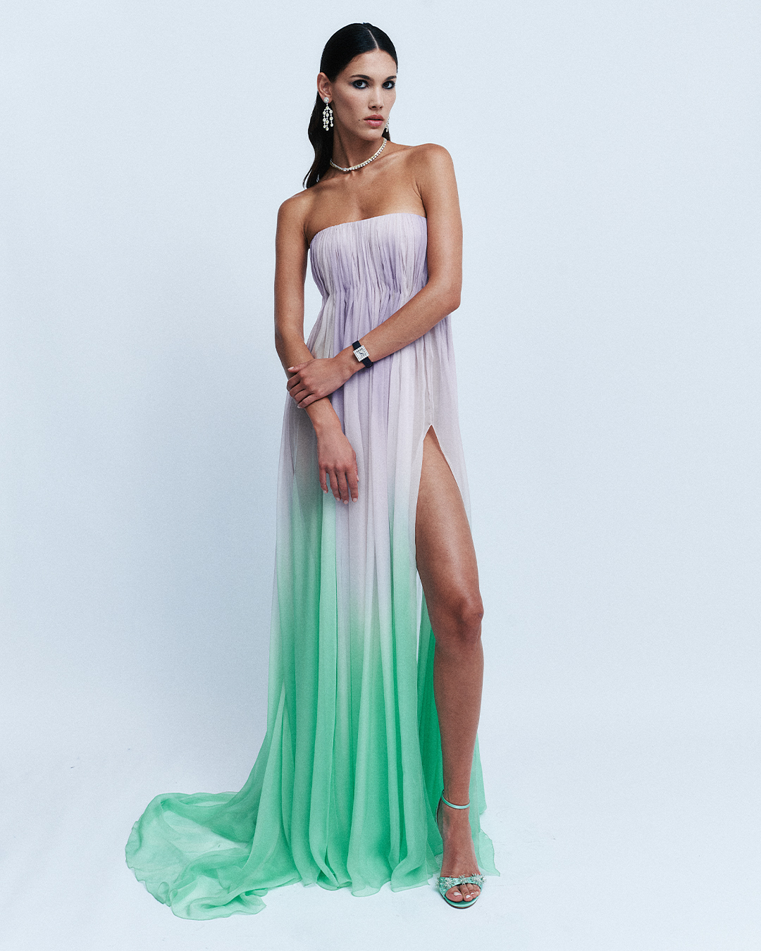 The jewellery was styled alongside couture silhouettes in soft pastel and gradient hues, creating a balanced visual contrast that allowed the pieces to stand out. Strapless gowns and fluid structures ensured a clear focus on the jewellery, reinforcing Chopard’s emphasis on elegance, proportion, and wearability.