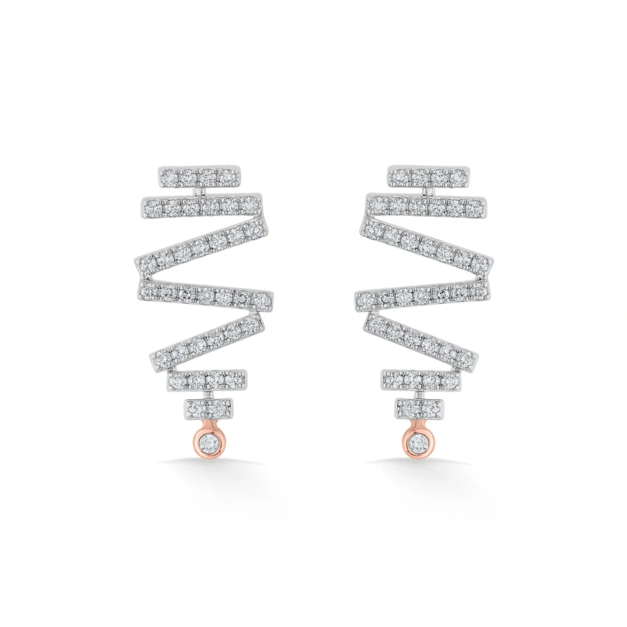 With their bold zig-zag silhouette and shimmering diamond pave, the Deck Up Glitz Wave Zig Diamond Earrings echo the energy of festive nights and winter celebrations. The interplay of white and rose tones reflects the glow of Christmas décor, making them an ideal statement for cocktail evenings, holiday parties, and glamorous year-end affairs.