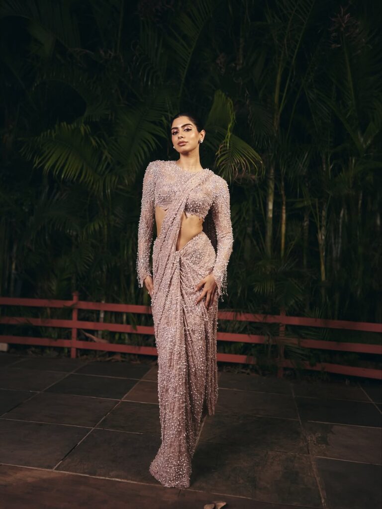 Khushi Kapoor ushered in the festive season with a dazzling beaded saree gown that merged youthful charm with structured elegance. The modern drape and subtle shimmer reflected Khushi’s evolving fashion identity — poised yet playful.