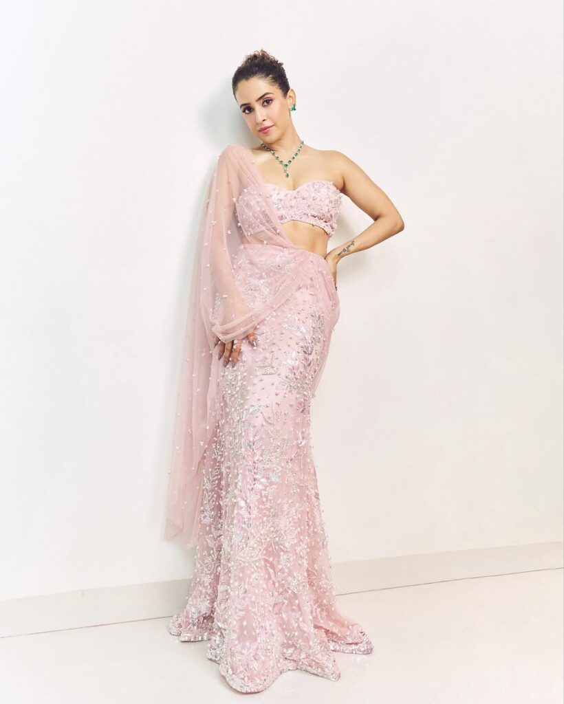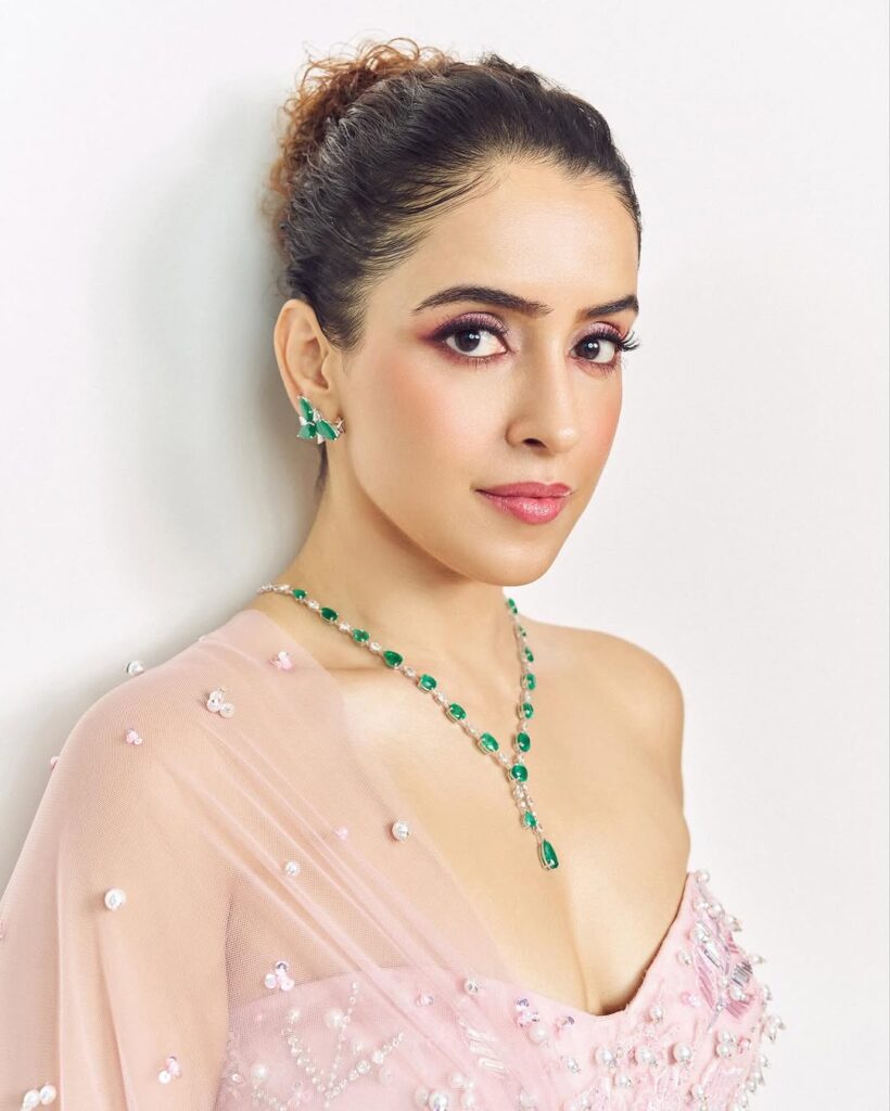 Actress Sanya Malhotra brought soft radiance to the night in a pastel pink saree adorned with delicate sequins and a sheer drape. The addition of a striking emerald necklace lent her ensemble a refreshing contrast, enhancing her naturally luminous presence. The look was understated yet striking — much like Sanya herself.