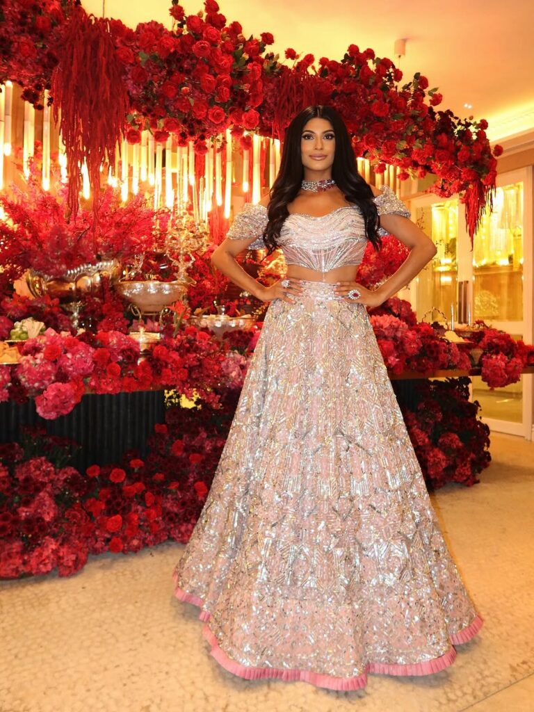 Fashion influencer Farhana Bodi turned heads in a breathtakingly embellished couture ensemble by Manish Malhotra. The outfit’s intricate detailing and opulent craftsmanship perfectly reflected the designer’s festive aesthetic.