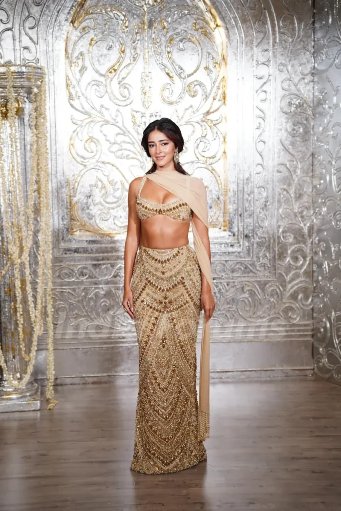 Golden hues met youthful glamour as Ananya Panday made a stunning entrance in a shimmering gold ensemble by Manish Malhotra. The heavily embellished outfit, featuring intricate embroidery and a contemporary drape, showcased the designer’s signature blend of heritage and haute couture.