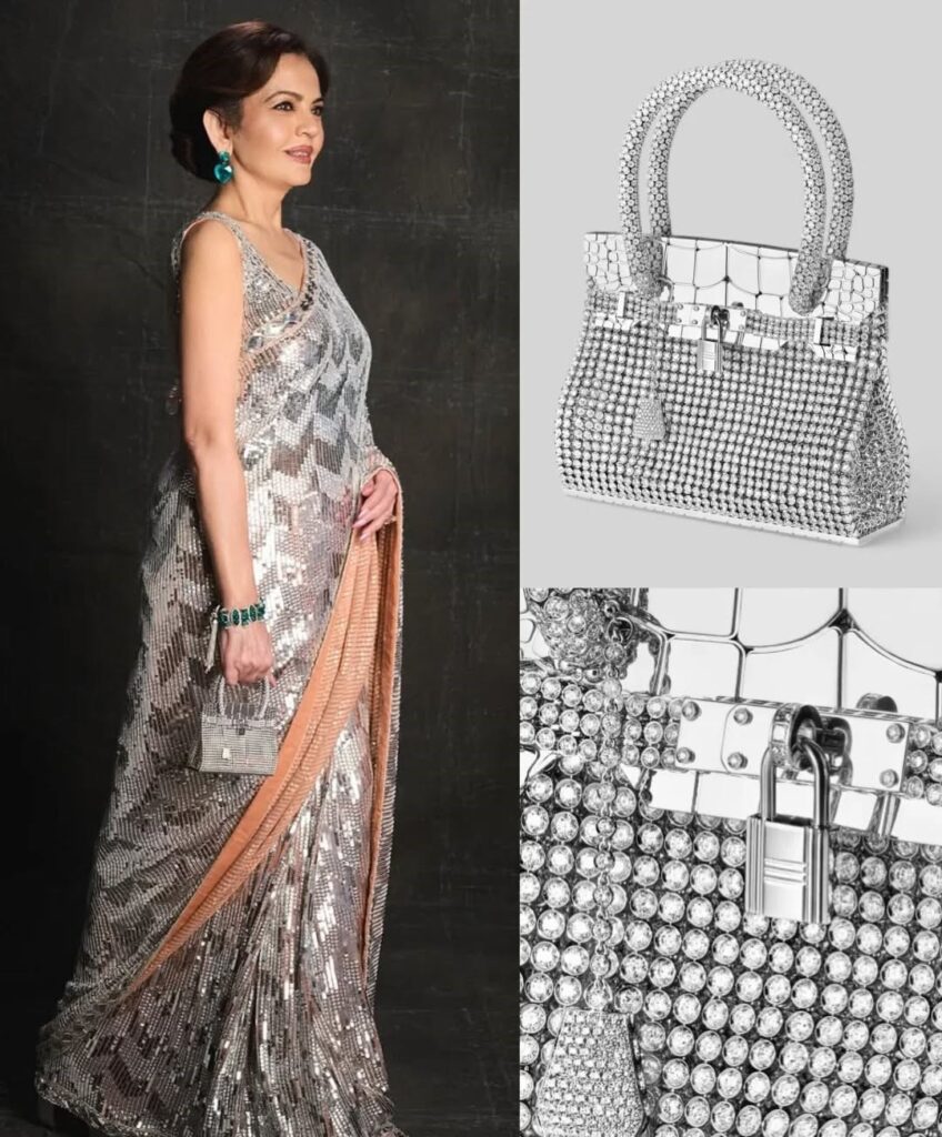 Philanthropist and business magnate Nita Ambani made a majestic statement in a silver sequin saree from Manish Malhotra’s couture collection. The ensemble, defined by chevron detailing and luxe craftsmanship, radiated timeless opulence.