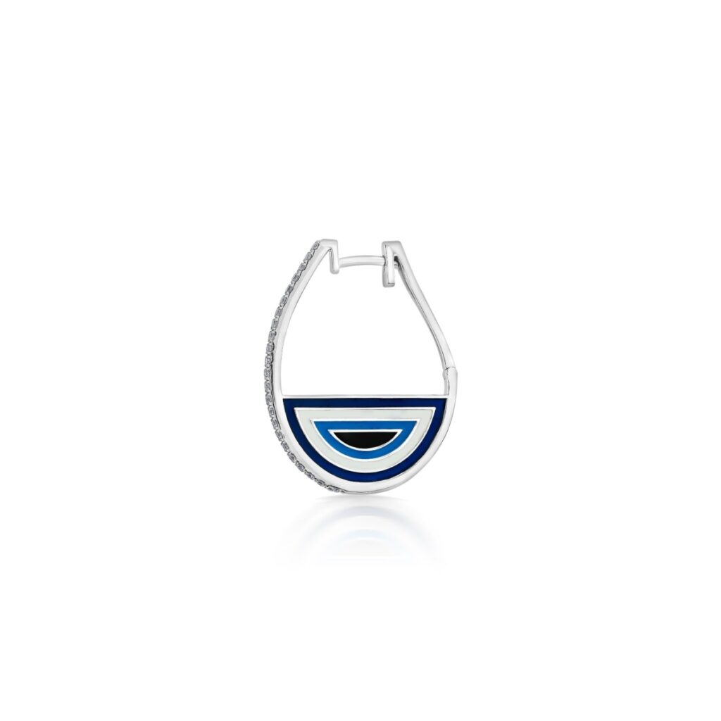Sculpted in 9kt white gold, these hoop earrings offer a fresh, playful take on the evil eye. Sky-blue topaz, enamel detailing, and softly set diamonds come together in a way that feels light and expressive rather than formal. Balanced and contemporary, the hoops sit comfortably between statement and subtlety, designed for effortless, everyday wear with a sense of intention.