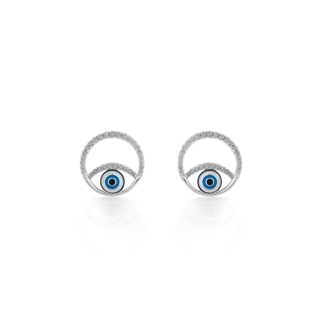 These earrings reinterpret the traditional protective symbol through soft curves and clean geometry. A circular contour gently frames the evil eye, outlined with a halo of diamonds that bring subtle elegance to the overall silhouette. The overall effect is balanced and understated, playful in meaning, polished in execution, and easy to imagine as an everyday signature.