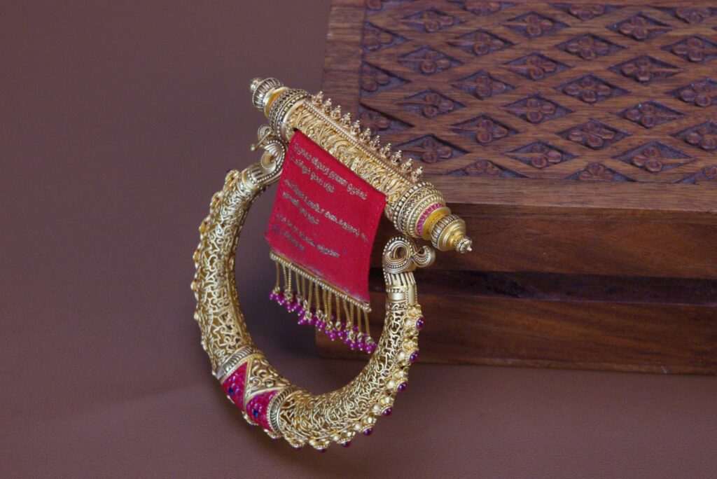 The Brilliant Bharath – Tamil Tribute Kada stood out as a masterful ode to Tamil language and culture, inspired by the timeless wisdom of the Thirukkural. Featuring scroll-inspired artistry, intricate filigree Uyir Ezhuthukal, and inscriptions of “Valluvan” and “Vasuki,” the Kada symbolises virtue, prosperity, and love—celebrating India’s enduring artistic and literary heritage.