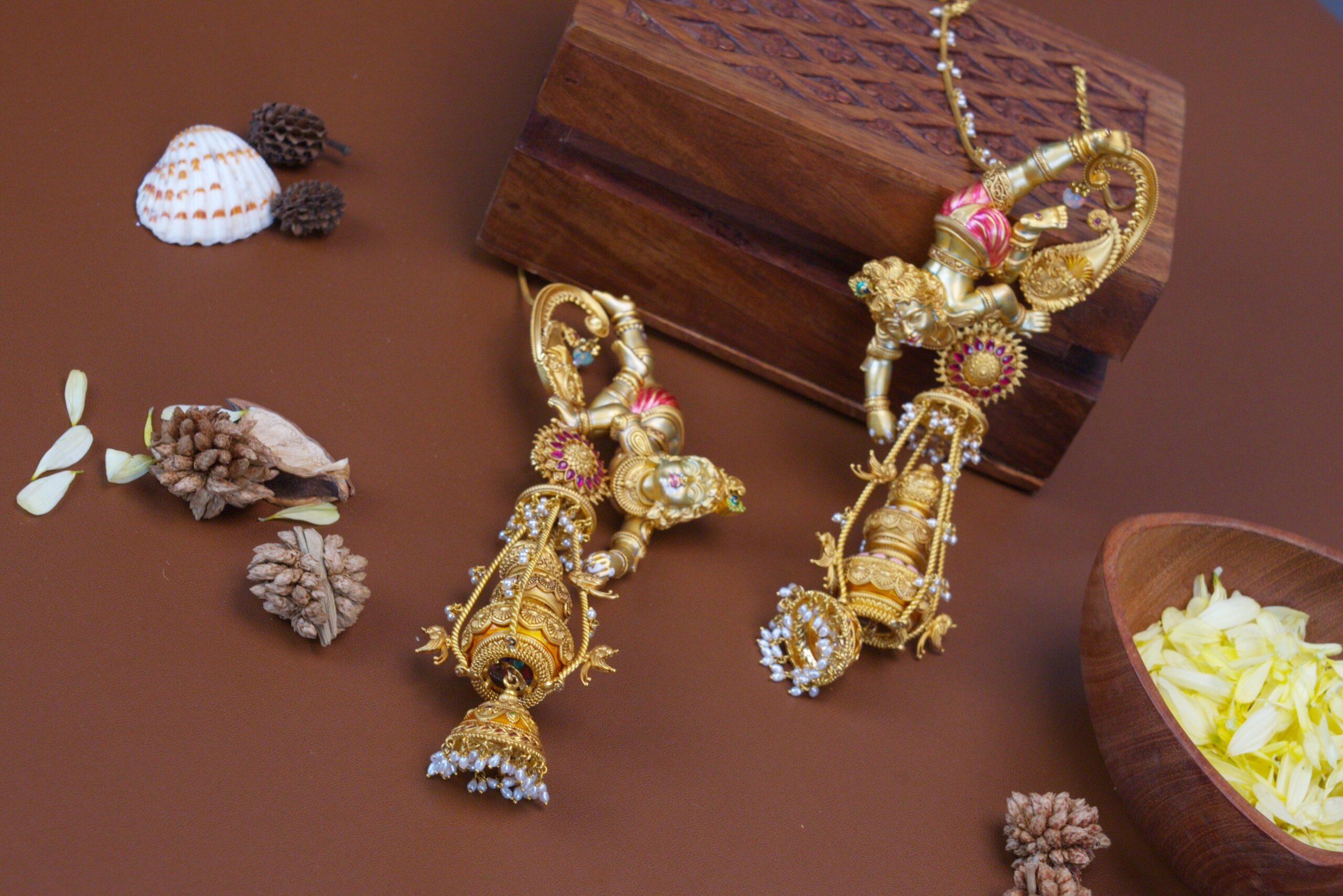Equally captivating were the Krishna Butter Leela Earrings, playfully inspired by Lord Krishna’s iconic butter-stealing leela. Designed with Krishna reaching for a hanging pot of butter, the earrings feature exquisite plique-à-jour enamelling, lending a luminous, glass-like translucence. The piece joyfully blends devotion, traditional Tamil influences, and fine craftsmanship.