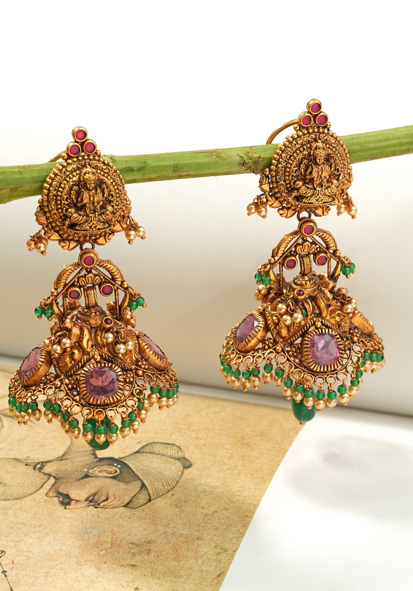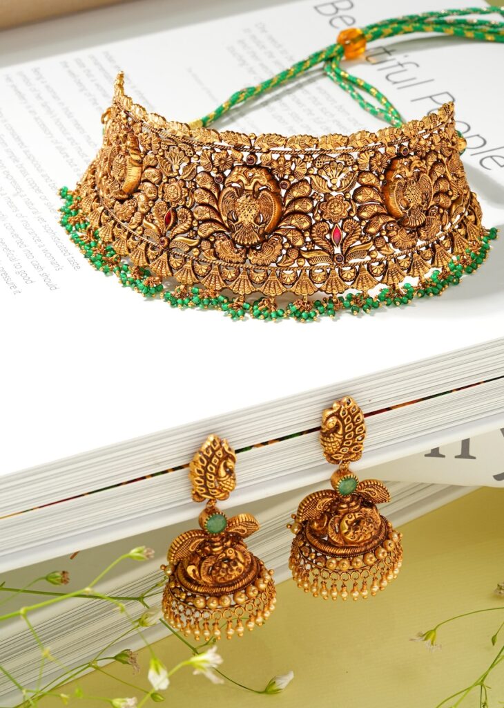 The Temple Treasures collection features statement-heavy sets, intricately designed earrings, and ornate pieces crafted in rich gold tones, inspired by classical temple aesthetics. The designs feature fine detailing, traditional carvings, and bold silhouettes, making them ideal for bridal wear, festive occasions, and heirloom-style styling.
