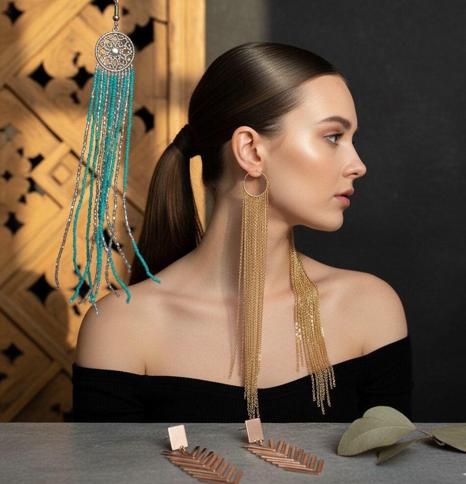 After seasons of sleek hoops and subtle studs, fringe earrings are back with a vengeance. Beaded, chained, or metallic, these swinging beauties add movement and drama—perfect for softening heavier fall silhouettes.
