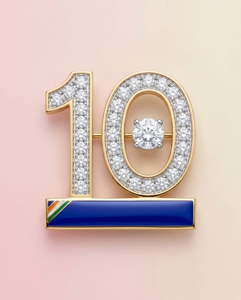 The collection features 49 limited-edition brooches, each representing one of Tendulkar’s 49 ODI centuries, symbolising a career that defined generations. Designed with precision-set diamonds and inspired by the iconic blue jersey and the legendary number 10, the pieces translate cricketing milestones into timeless wearable art.