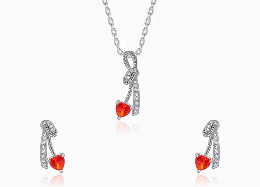Designed for women who wear emotion with assurance, this silver set captures connection through form and feeling. The pendant and matching earrings take shape as a tied ribbon, traced with zircons and finished with a striking red heart. This Valentine’s, GIVA brings you All Yours – signature ice-cut stones in soulful shades, because some emotions deserve more than words.