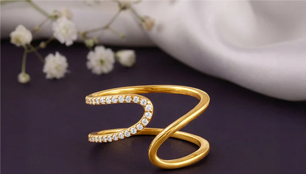 An edgy new design for someone who loves to keep it fun yet classy. This silver ring with gold plating features flowing, whimsical swirls, with selected sections studded with zircons for a soft shimmer.