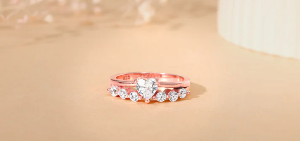 This rose gold ring features a dual-ring design — one ring holds a heart-shaped zircon at the centre, while the other is studded with sparkling zircons. Romantic, modern, and eye-catching.