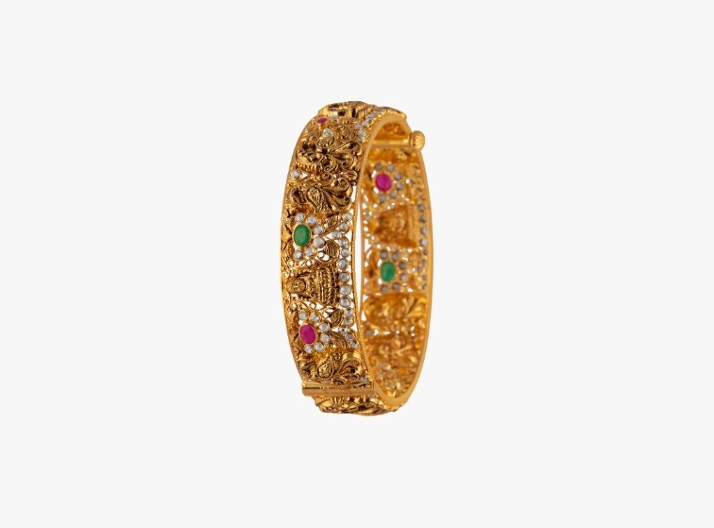 This ornate antique-finish gold bangle captures the vibrancy of Ugadi celebrations with its intricate detailing and colourful gemstone accents. Featuring traditional temple-inspired engravings and pops of ruby and emerald tones, the design reflects heritage craftsmanship at its finest. Whether stacked with other bangles or worn as a standalone statement piece, it adds a festive glow to any celebration ensemble.
