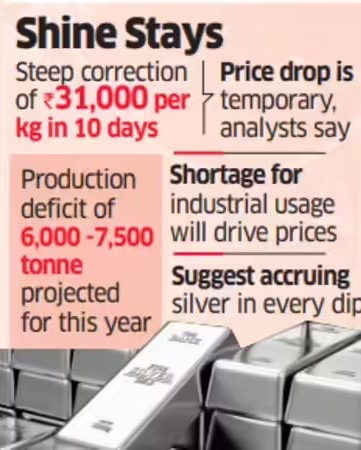 Silver prices have plunged nearly 17% from their recent record peak, with the metal losing about Rs.31,000 per kg in just ten days to trade at Rs.1.47 lakh per kg on Friday. The sharp correction comes amid improved supply in London’s bullion market — the global hub for precious metals — and profit-booking by investors after months of momentum-driven gains.
