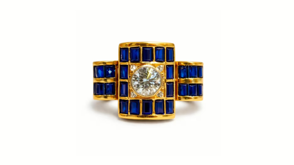 Berry’s choice reflects a more curated, “old-world” aesthetic.The Specifications of the rings are The Stone: A bezel-cut center diamond, estimated between 1.5 and 3.0 carats.The Setting: An architectural 18k yellow gold geometric frame.The Accents: In a bold departure from traditional pavé, the center stone is flanked by dark accent stones, likely onyx or deep sapphire.The Valuation: Estimated in the low hundreds of thousands, focusing on design rarity rather than sheer volume.