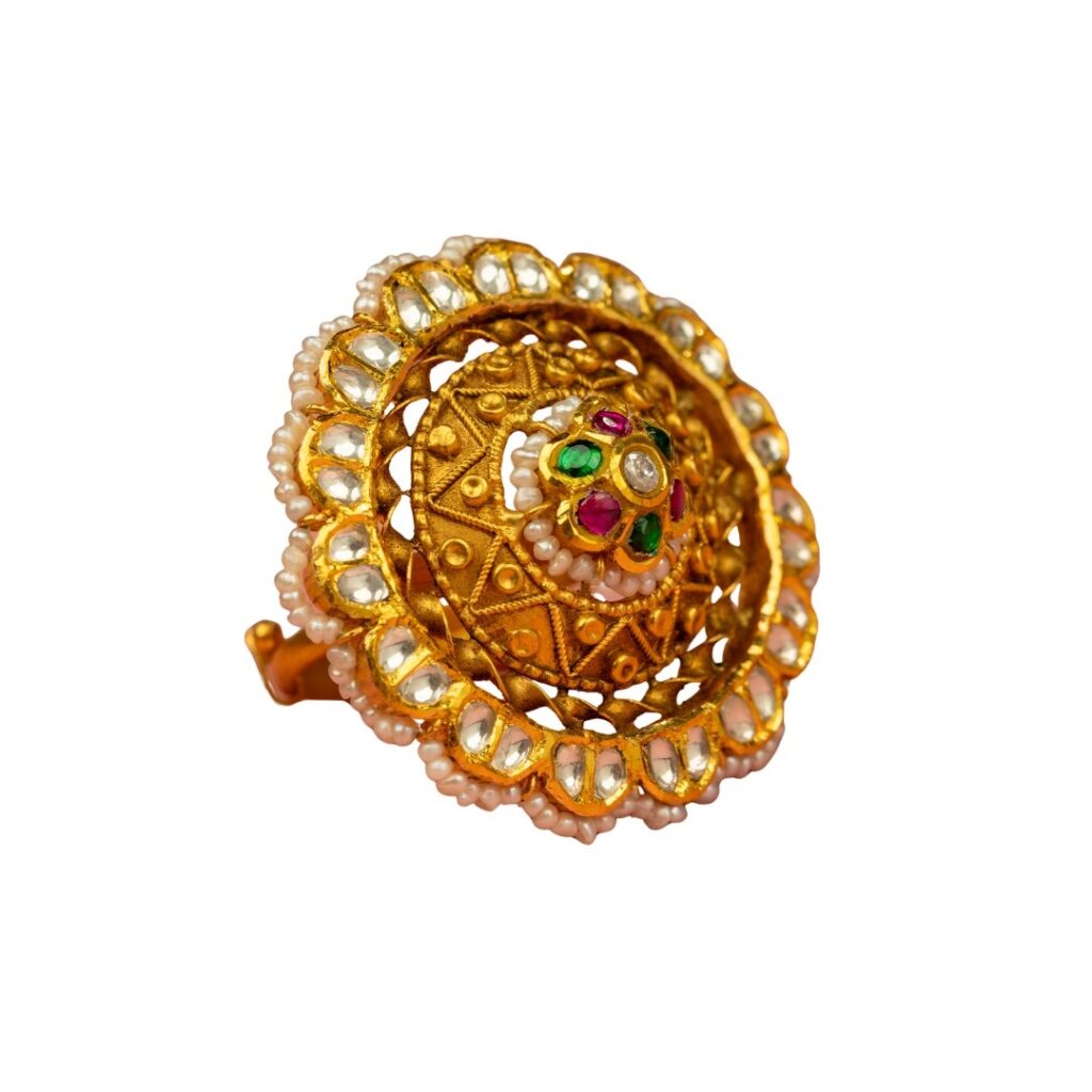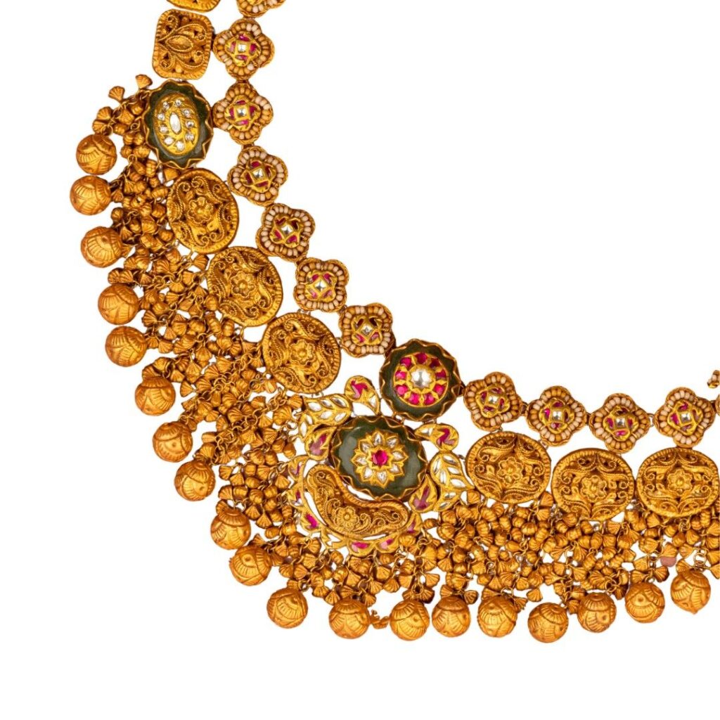 This range is crafted in 22kt gold and spans of statement necklaces, pearl chokers, layered temple designs, bold cocktail rings, bangles, and intricately detailed earrings. Temple-inspired pieces take centre stage, finished in antique gold and brought to life with intricate kundan and polki work, softened by delicate pearl accents. From pendants, rhythmic jhumka drops to refined chokers highlighted by floral centres, each piece balances grandeur with grace.