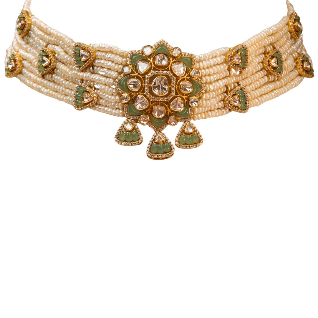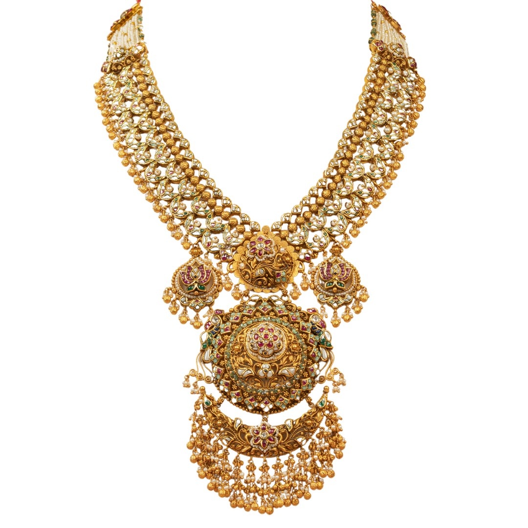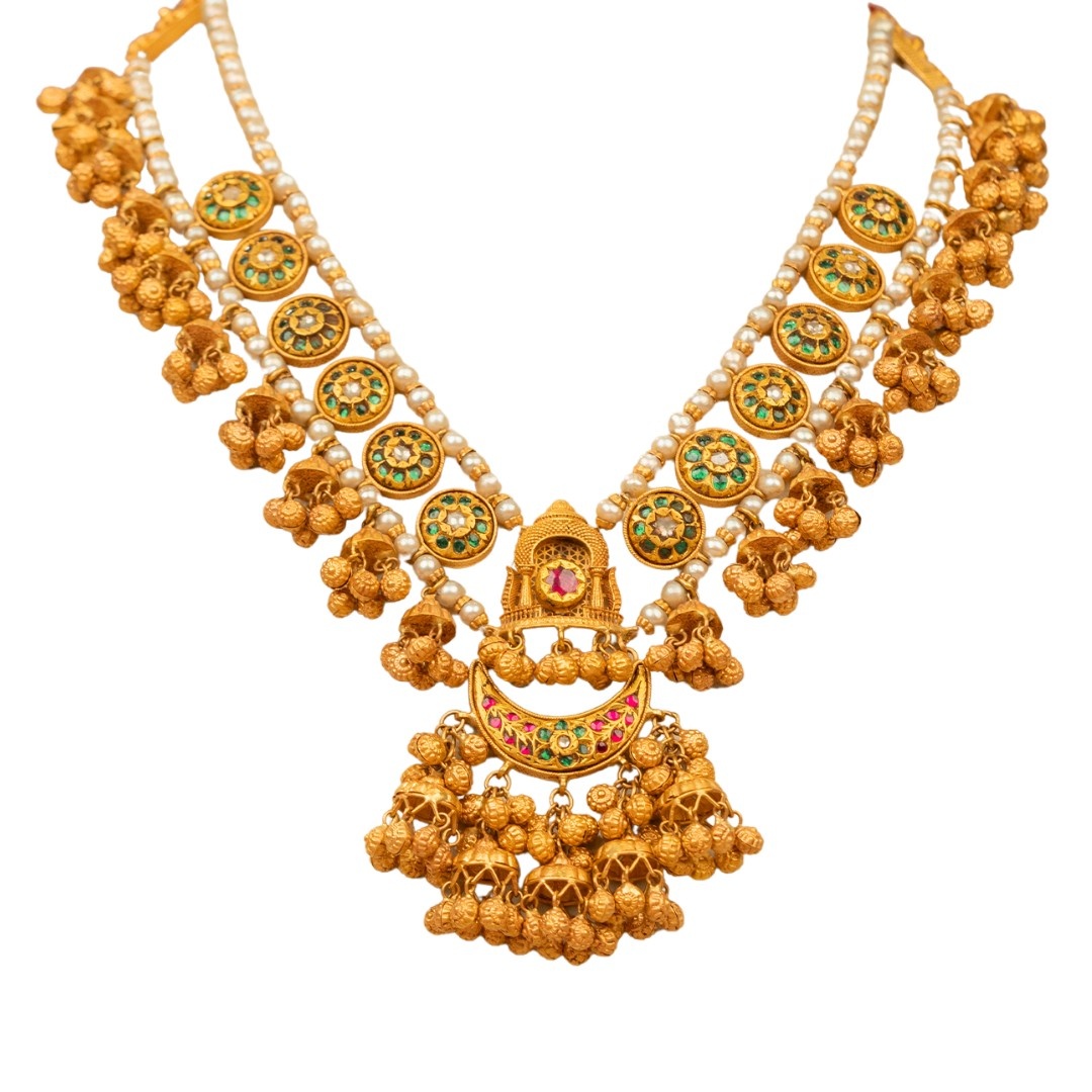 This range is crafted in 22kt gold and spans of statement necklaces, pearl chokers, layered temple designs, bold cocktail rings, bangles, and intricately detailed earrings. Temple-inspired pieces take centre stage, finished in antique gold and brought to life with intricate kundan and polki work, softened by delicate pearl accents. From pendants, rhythmic jhumka drops to refined chokers highlighted by floral centres, each piece balances grandeur with grace.