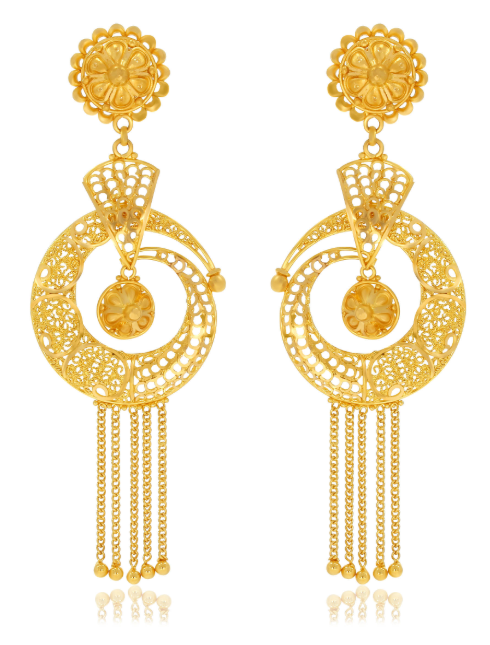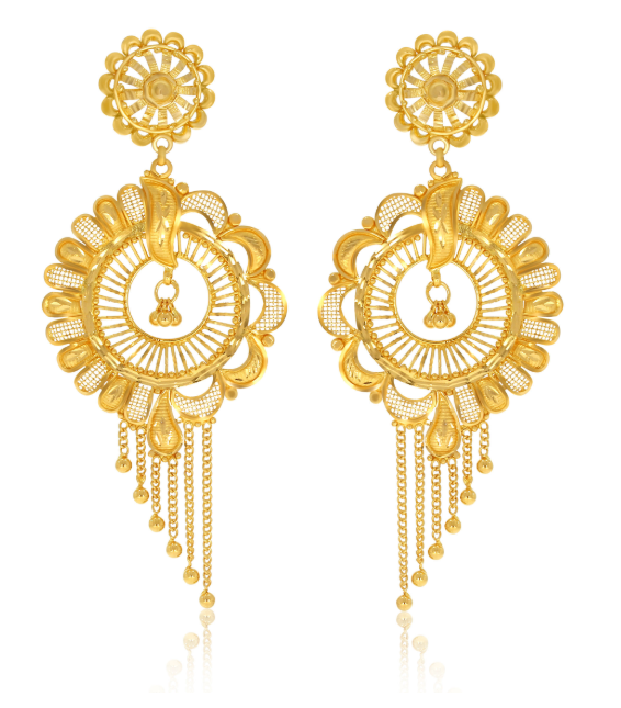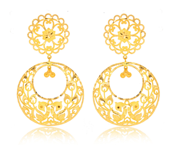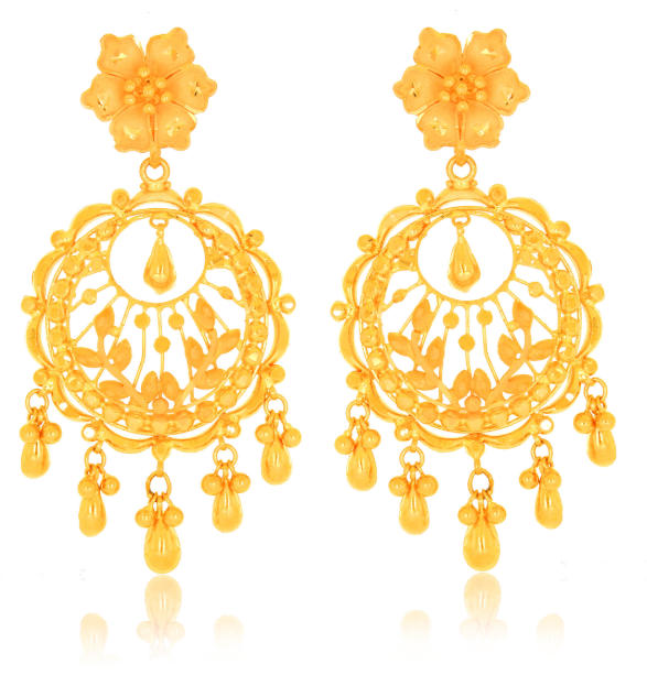 Designed with layered floral motifs and hanging drops, these chandeliers feel like a blooming bouquet brought to life. These 22-karat gold chandeliers have a unique, artistic floral design that instantly catches the eye. They add a soft, regal charm to any festive look while staying light, elegant, and impossibly photogenic.