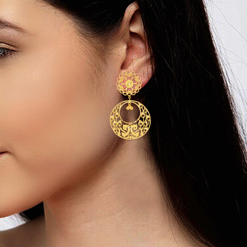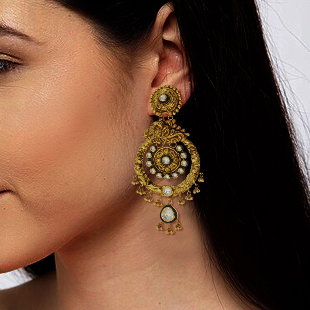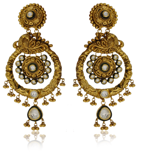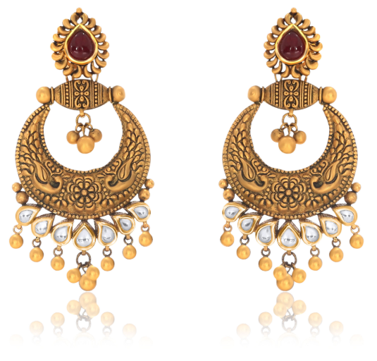The Royal gold chandbali’s give the ultimate queen vibes, and takes you back to the traditional old days but with a modern twist, with an intricate design of peacock and floral motifs in a circular pattern and kundan embellishment in contrast shades makes heads turn.