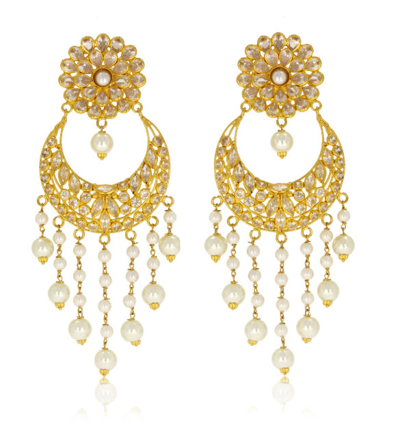 These gold chandbalis blend kundan with chinese pearls that sparkle with a graceful, old-world silhouette, giving you that soft, glamorous glow perfect for weddings and festive nights, the kind of piece that instantly makes your look stand out without trying too hard.