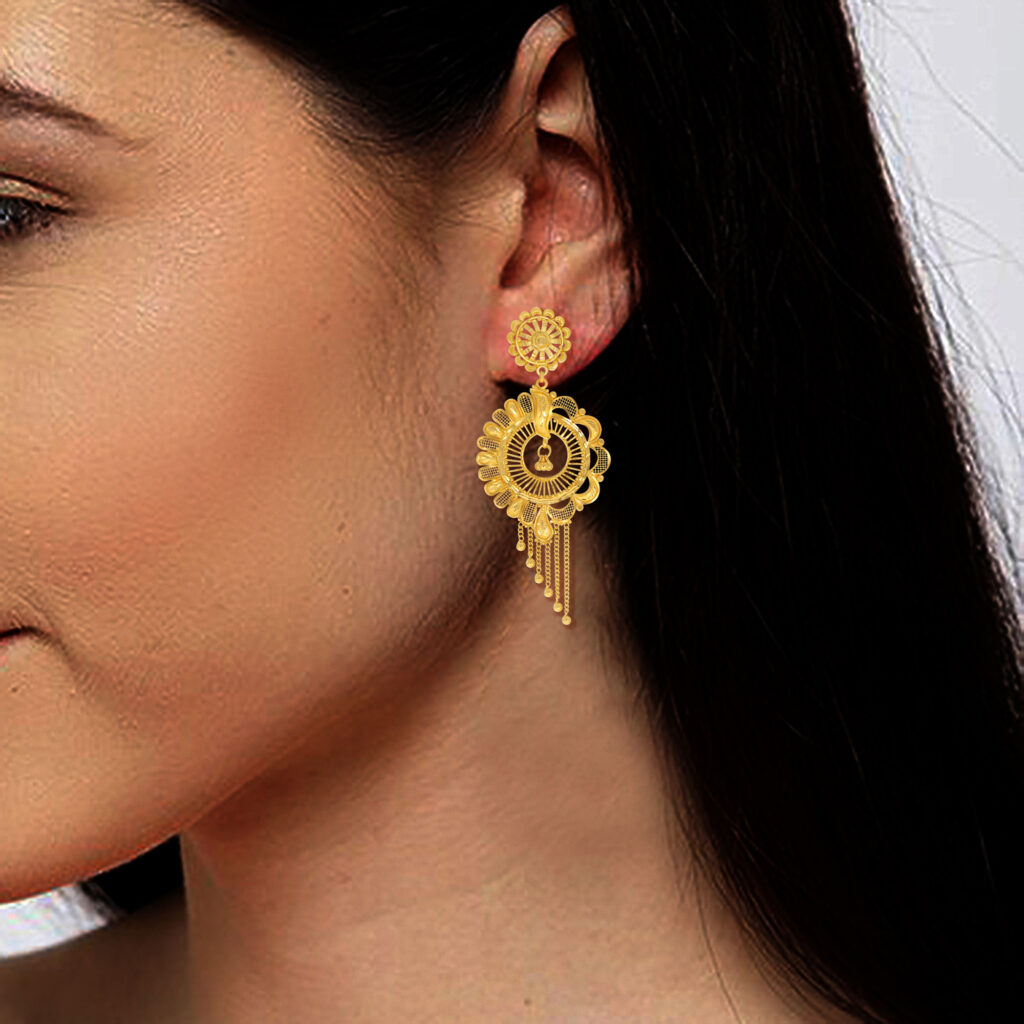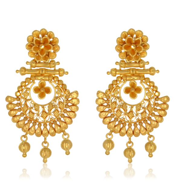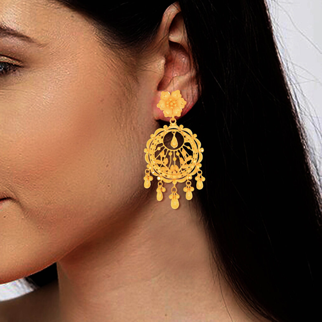 These floral gold chandelier earrings shine with an intricate flower-and-cuttay detailing in rich 22-karat yellow gold, a delicate yet statement-making pair that transforms a lehenga or saree into something truly regal.
