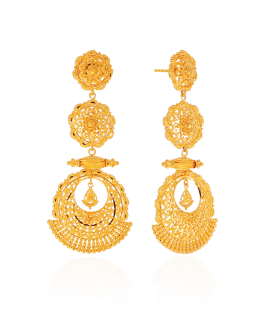 These 22 kt yellow gold Sunhera Mayurpankh chandbali’s bring light, happiness and colours to life. These delicately crafted chandbali’s are loved by modern Indian brides.