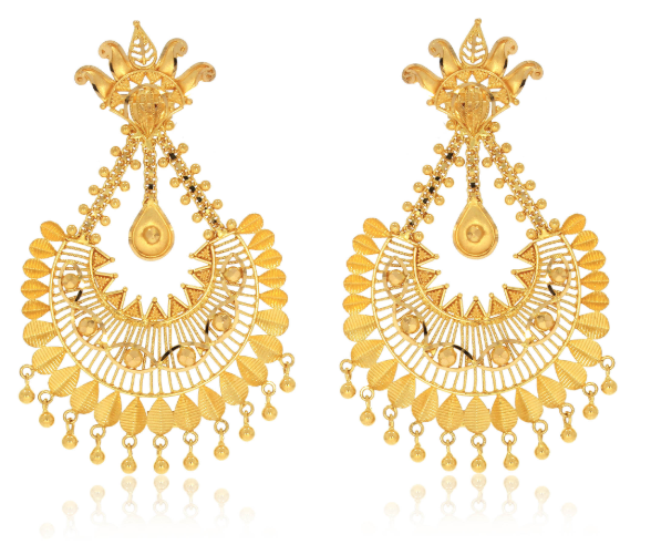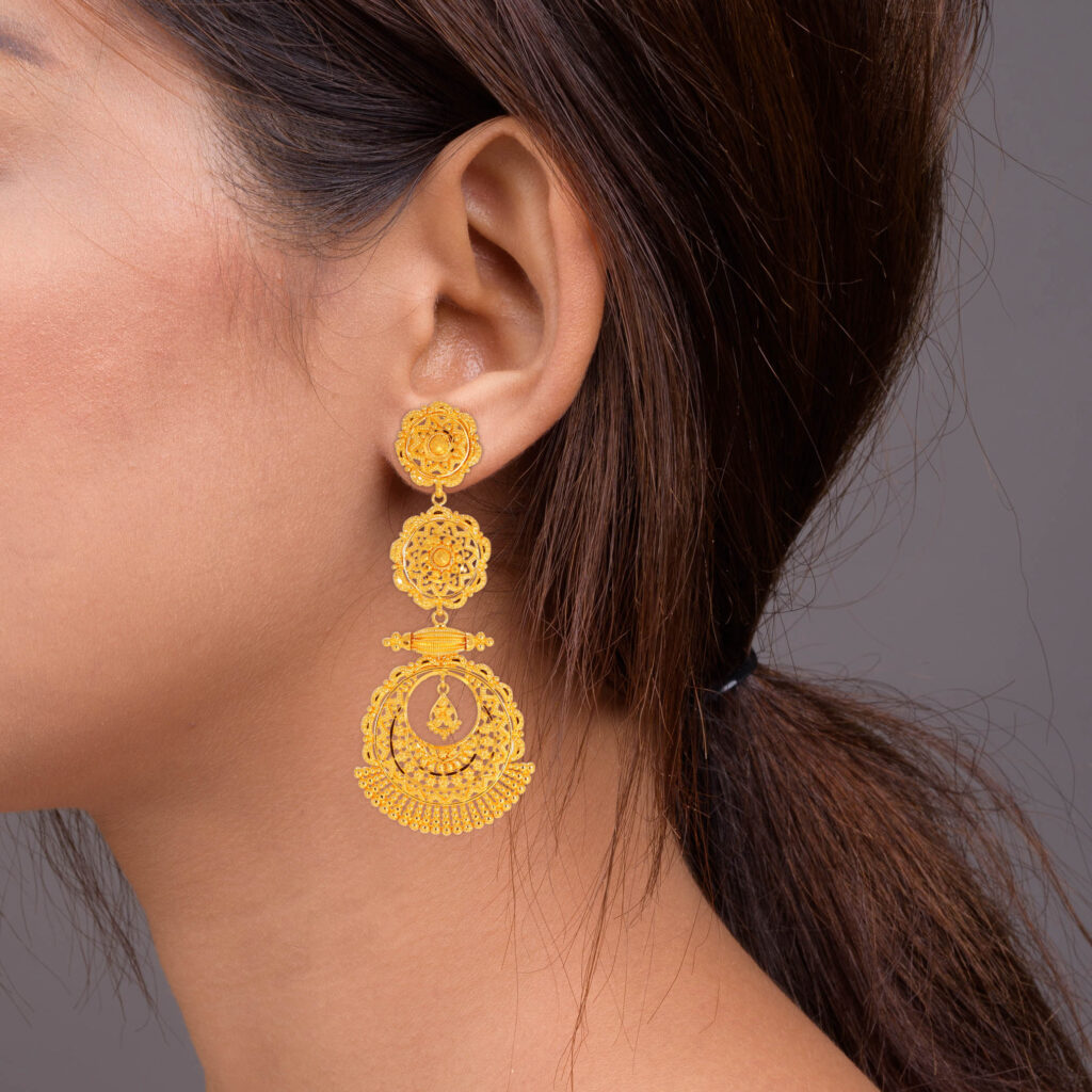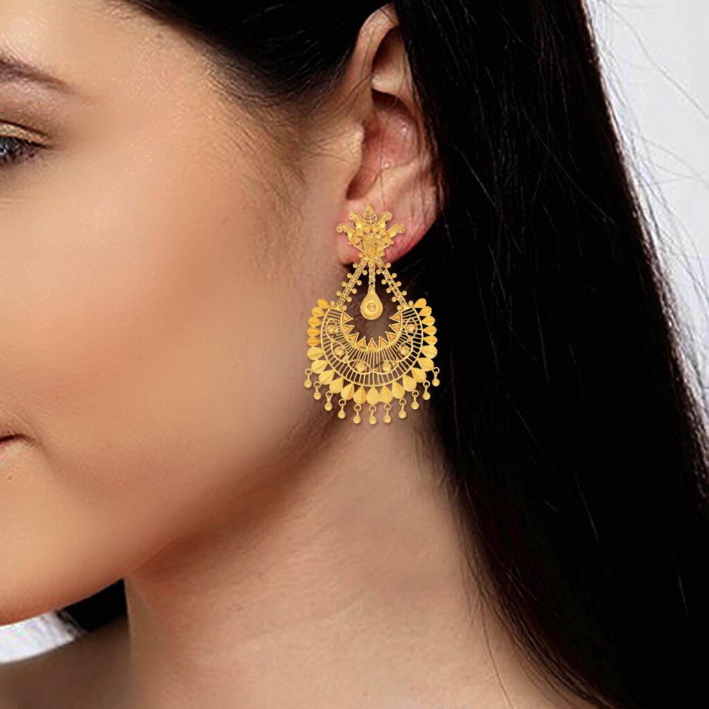 These traditional-style chandbalis, shaped like crescent moons and crafted in warm gold have a traditional yet sophisticated charm. The curved silhouette, ornate detailing and symmetrical design make them look like heirloom pieces, perfect for elevating a saree or lehenga into a subtly luxurious statement. Their classic elegance and refined craftsmanship add a sense of tradition and artistry, giving any festive or wedding-day outfit a touch of understated grandeur.
