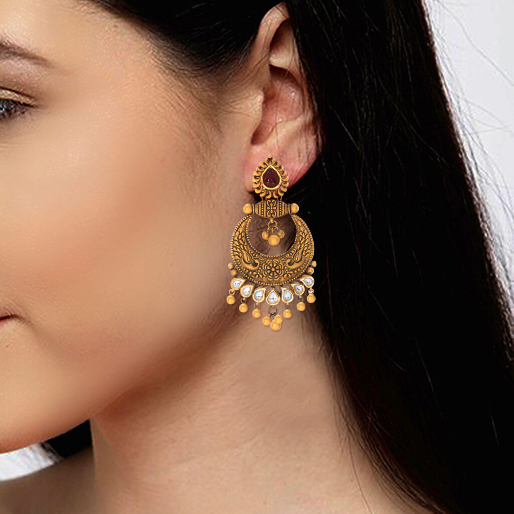These antique-finish gold chandbalis bring a timeless, regal elegance, with warm muted tones and traditional ornate detailing that feels beautifully heritage-inspired. Their delicate curves and intricate craftsmanship give a soft, vintage glow that instantly lifts any ethnic outfit. Paired with a lehenga or saree, they don’t just accessorize, they complete the look with a graceful, classic charm.