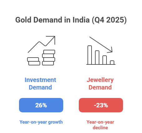According to a World Gold Council (WGC) report released on January 30, 2026, India’s Q4 2025 gold demand showed a stark contrast between sectors: record prices caused jewellery demand to drop by 23% to 145.3 tonnes, while total investment demand rose 26% to 96.0 tonnes, indicating a shift towards gold as a hedge against volatility.