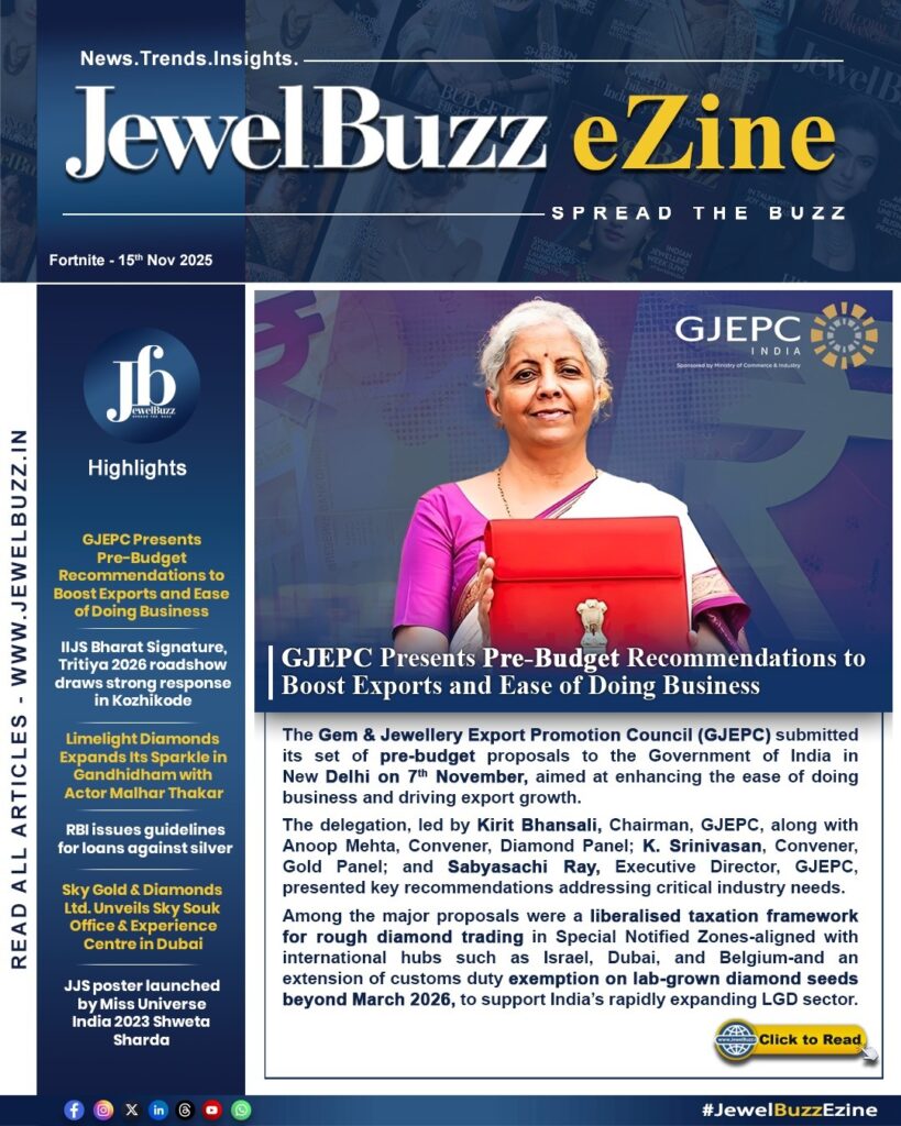 The JewelBuzz E-zine, the digital newsletter from A M MEDIA, is published every fortnight and offers a concise yet comprehensive roundup of industry news, developments, brand launches, and retail expansions over the past 15 days. With its user-friendly format and wide digital reach, it has become a preferred platform for both JewelBuzz readers and advertisers alike.