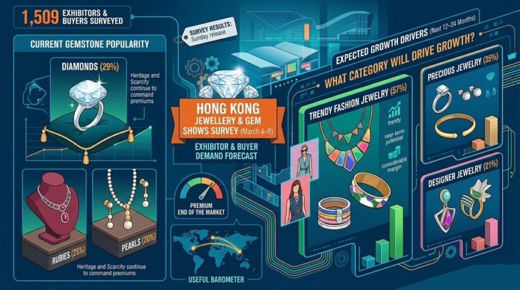 Diamonds led all gemstones in popularity at 29%, with rubies second at 25% and pearls third at 20% — a ranking that broadly tracks with the premium end of the market, where heritage and scarcity continue to command premiums. Yet the more telling signal may lie in what category exhibitors expect to drive growth: trendy fashion jewelry, cited by 57% of respondents as having the strongest near-term potential, outpaced precious jewelry at 35% and designer jewelry at 21% by a considerable margin.