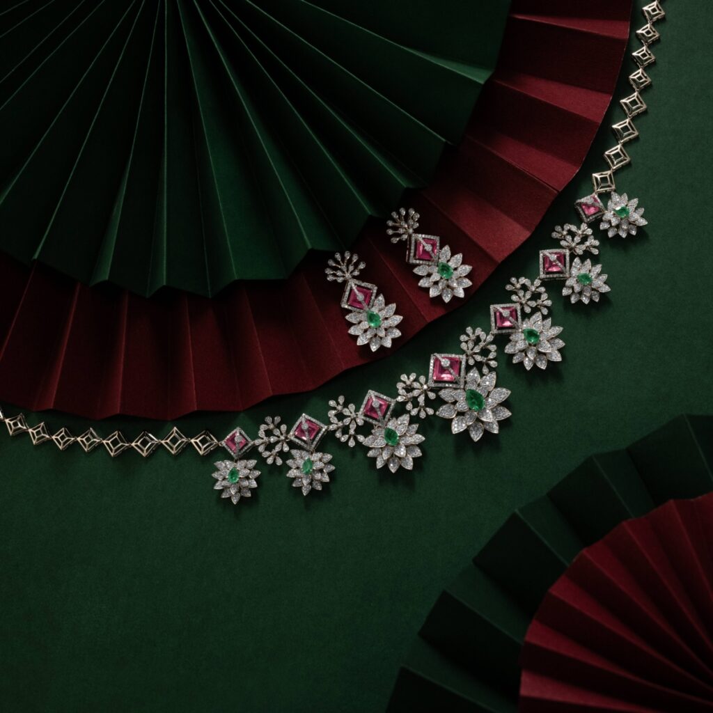 Floral Radiance: The Emerald and Ruby Diamond Set Celebrate Holi with refined sparkle through this exquisite diamond set from Kalyan Jewellers. Intricate floral motifs, encrusted with diamonds, are highlighted by pear-shaped emeralds and vibrant ruby accents, bringing together fresh greens and festive pinks in perfect harmony. Elegant yet celebratory, this set adds a sophisticated glow to your look and pairs beautifully with a rich silk saree or a contemporary pastel ensemble