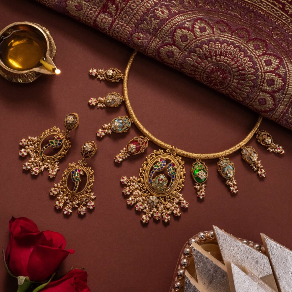 Festive Spectrum: The Multicolour Heritage Set Step into the spirit of Holi with this resplendent antique set from Kalyan Jewellers, showcasing a vivid blend of emerald, ruby, and turquoise hues that echo the festival’s playful colours. Detailed peacock motifs and delicate seed pearl accents lend the piece a rich, heritage-inspired charm. Perfect for festive gatherings, it pairs beautifully with a cream silk saree or a soft pastel ensemble, allowing its vibrant tones to shine effortlessly.