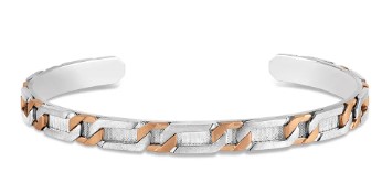 The Johan Platinum and Rose Gold Kada merges cool platinum tone with warm rose gold that mix is perfect for a stack because it lets you bridge metallic tones (silver/platinum + gold/rose gold) in a single piece. Use it as a mid-weight anchor alongside slimmer pieces for contrast.