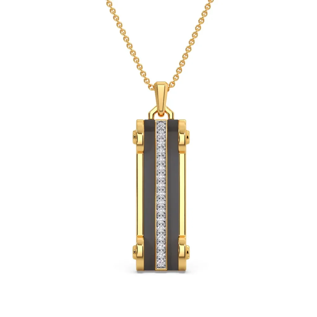 The Enzo Diamond Pendant from Candere blends modern design with refined elegance. Crafted in polished gold, the pendant features a sleek vertical silhouette accented with a line of sparkling diamonds set against a textured dark backdrop. Bold yet sophisticated, it adds a contemporary edge to everyday style while making a subtle statement.