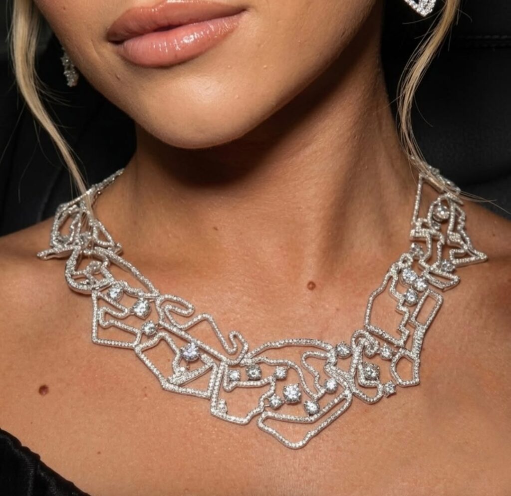 Titled “La Velocit” (The Speed), the necklace was crafted by Australian atelier Martin Rogers Jewellery. The extraordinary piece features approximately 1,800 diamonds totalling 25 carats, intricately arranged to trace the outlines of iconic Formula 1 circuits from the global racing calendar.