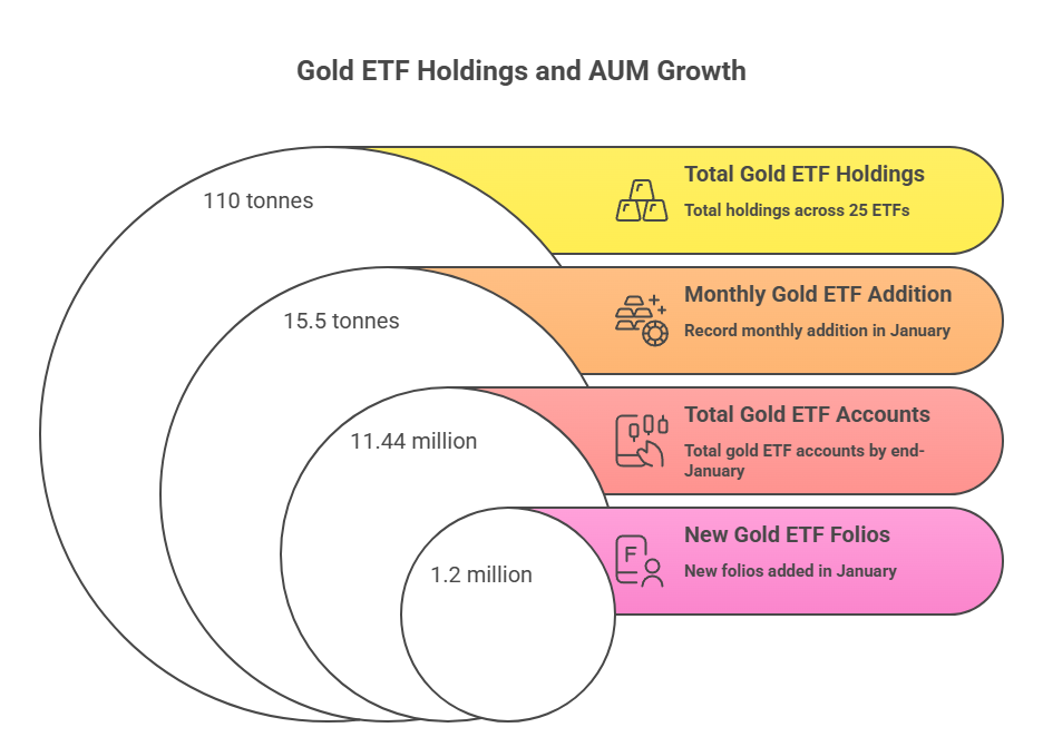 Investor participation also strengthened significantly, with 1.2 million new folios added in January, taking total gold ETF accounts to 11.44 million.