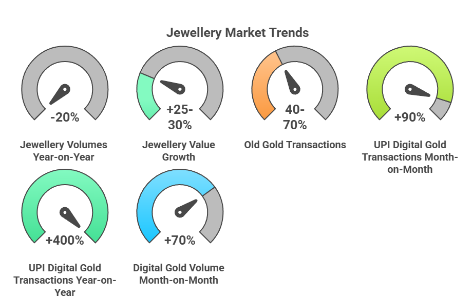 Jewellery demand has turned more measured. Consumers are opting for staggered purchases instead of lump-sum buying, even for weddings. While jewellery volumes are estimated to be ~20% lower year-on-year, value growth has risen 25–30%, supported by elevated prices. Exchange of old gold remains high, accounting for 40–70% of transactions in some markets. Liquidation activity remains limited.
