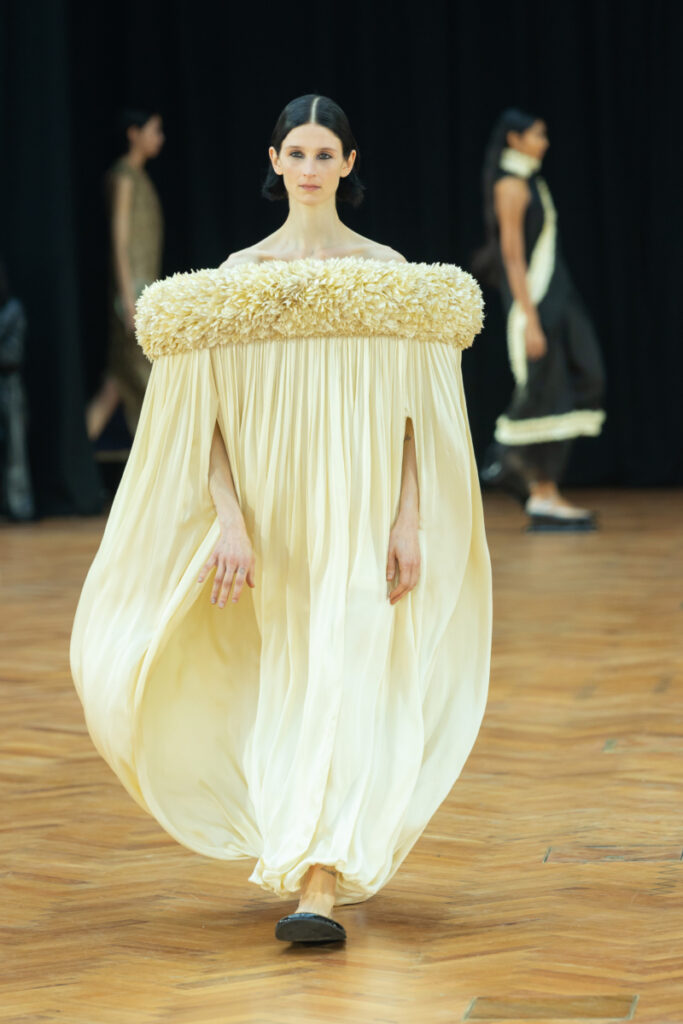 At its inaugural show on an international stage, Raw Mango debuted their Fall Winter 2026 collection It’s Not About The Flower at London Fashion Week. Drawing inspiration from the ubiquitous garland—which is a humble, albeit important part of everyday life in South Asia—the collection blurs the line between decoration and that which is decorated. The focus with this collection shifts from the individual motif to the arrangement, from surface-level engagements to a deeper interrogation of value and beauty, from the flower to the garland.