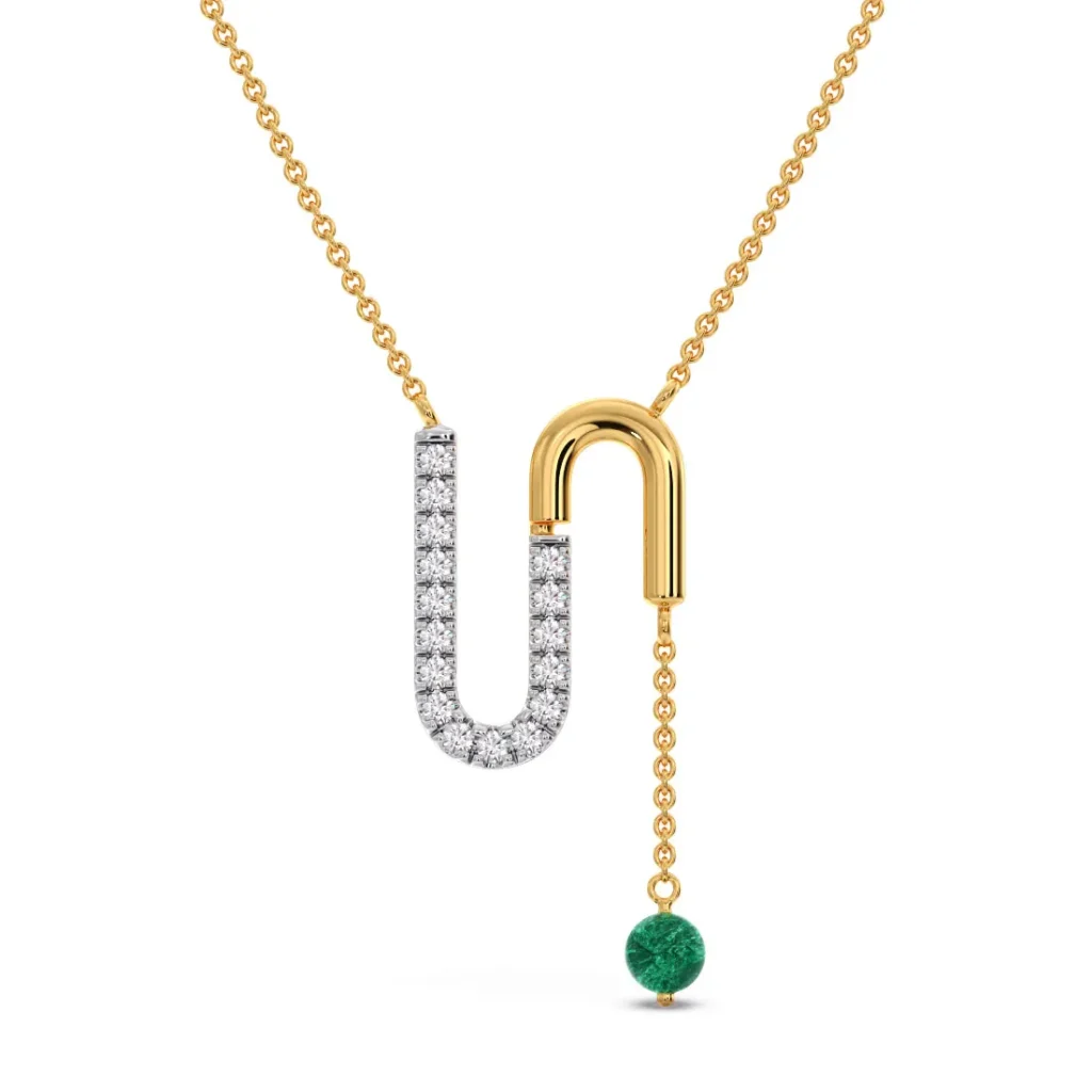 Modern and effortlessly refined, The Jayla Lariat Necklace is crafted in fine gold with a sleek diamond-studded curve paired with a polished gold link detail. A delicate drop chain finished with a vibrant gemstone adds movement and contrast, creating a contemporary piece designed to stand out with understated elegance.