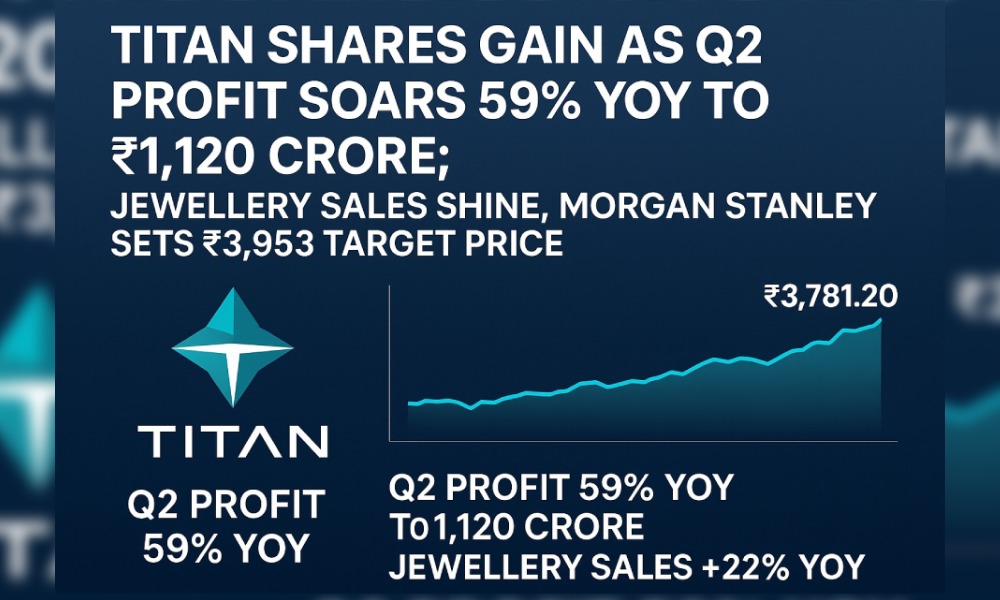 Titan Shares Gain as Q2 Profit Soars 59% YoY to ₹1,120 Crore; Jewellery Sales Shine, Morgan Stanley Sets ₹3,953 Target Price
