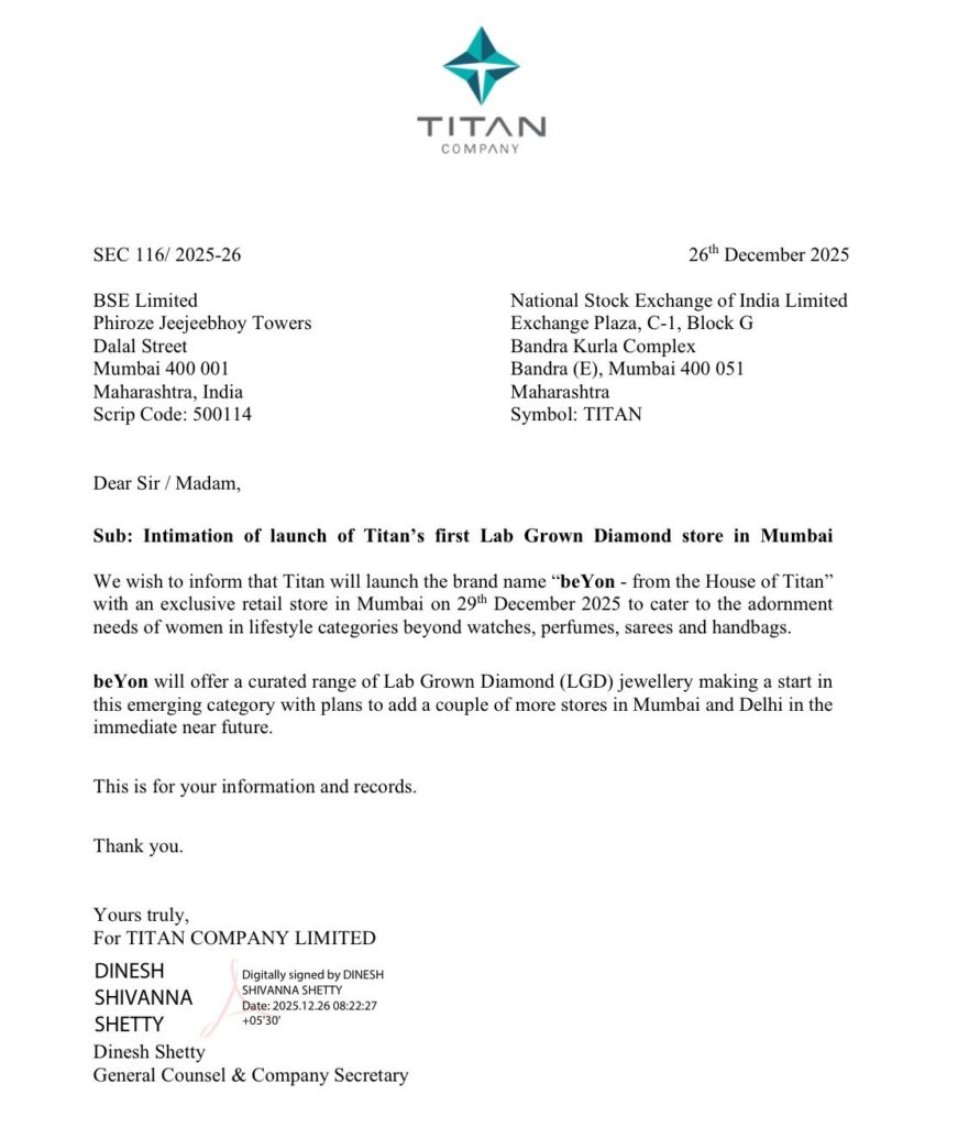 Titan Company Limited has announced its entry into the lab-grown diamond jewellery segment with the launch of beYon – from the House of Titan, its first exclusive retail brand in this category. The inaugural store is set to open in Mumbai on 29 December 2025, signalling a significant diversification of Titan’s lifestyle and jewellery portfolio.