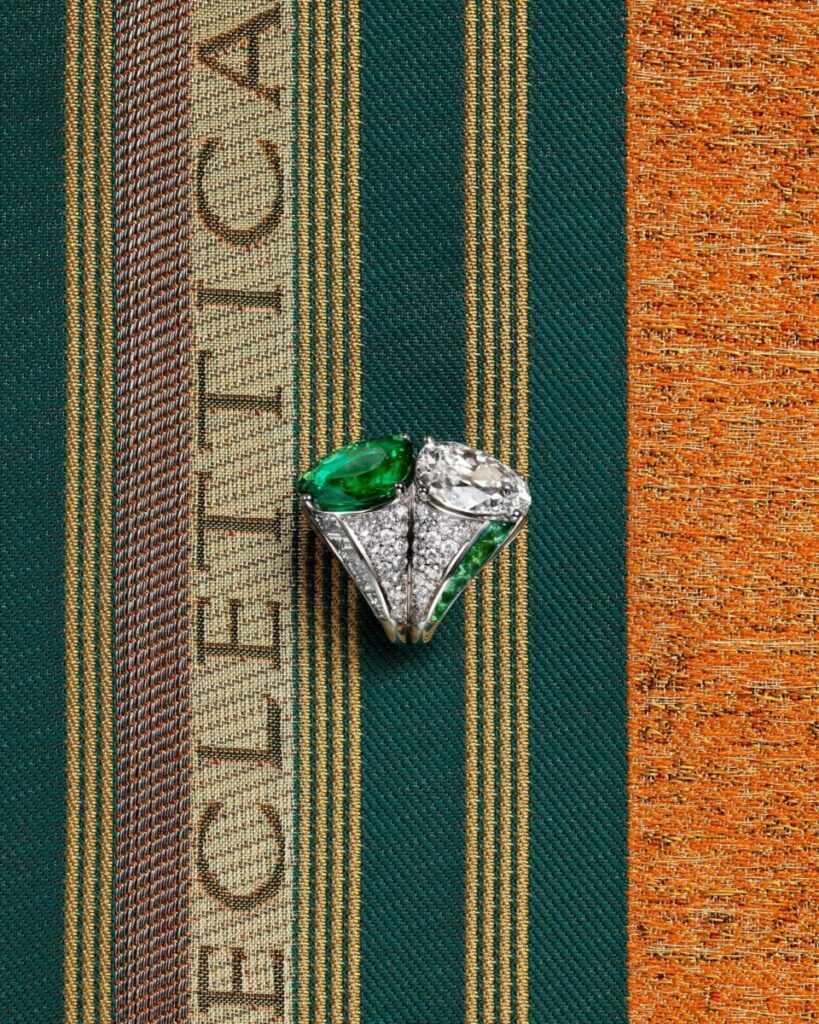 Drawing inspiration from Rome’s layered artistic heritage, Eclettica explores sculpture, painting, and architecture as creative foundations. Through these disciplines, the collection plays with volume, light, color, and structure, translating them into bold, wearable works of art. This multidisciplinary approach reflects Bvlgari’s long-standing philosophy of transforming contrast into harmony—a creative method embedded in its identity since its founding in 1884 by Sotirio Bulgari.