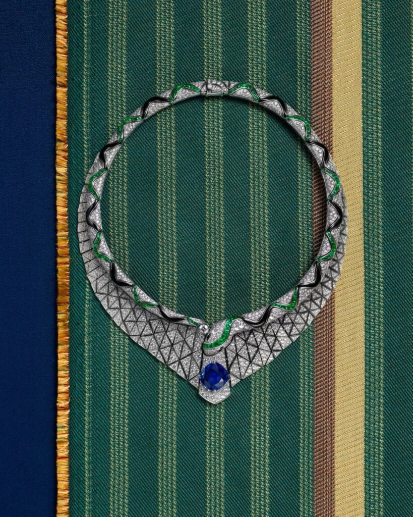 The collection showcases a series of extraordinary pieces, including the Seres Scarf necklace inspired by Art Deco geometries and the works of Tamara de Lempicka, crafted with over 1,180 components and centered around a 31.90-carat sapphire.